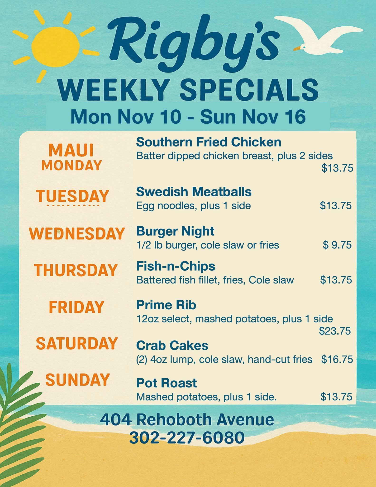 All specials are on a "while supplies last" basis, so get here to Rigby's early! The daily specials menu changes every Sunday evening.